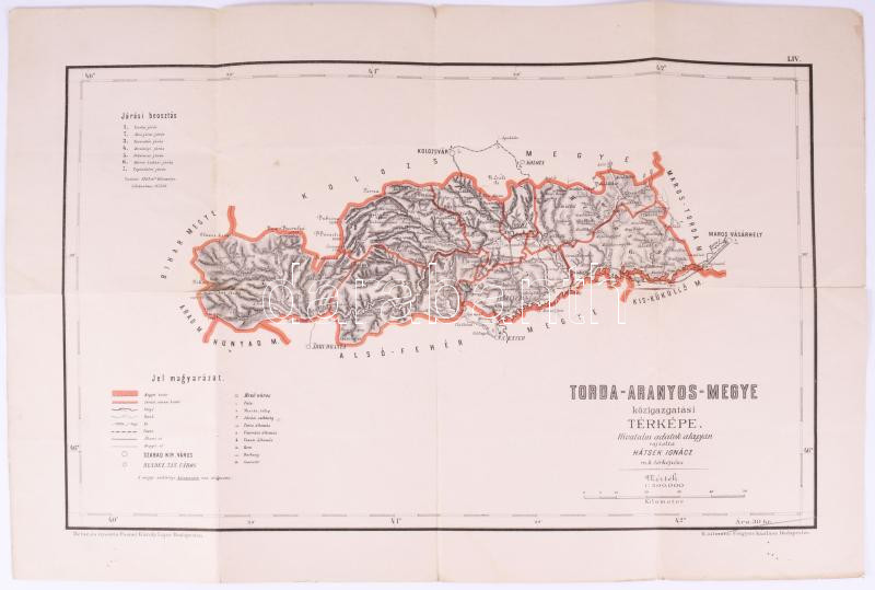 cca 1890-1910 Torda-Aranyos megye közigazgatási térképe. Hivatalos adatok alapján rajzolta: Hátsek Ignácz m. k. térképész. 1 : 500 000, metsz. és nyomta: Posner Károly Lajos, kiadja: Rautmann Frigyes, Bp. Kis szakadással, 53,5x38 cm