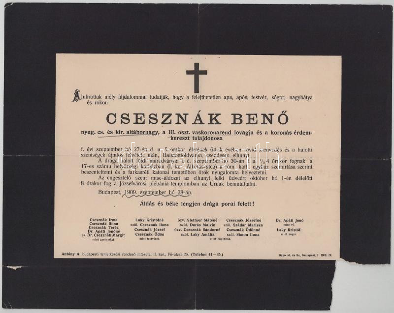 1909 Bp., Csesznák Benő (1845-1909) nyug. cs. és kir. altábornagy, a III. oszt. Vaskorona-rend lovagja, minisztériumi osztályvezető halotti értesítője, sarkán hiánnyal, 24x30,5 cm