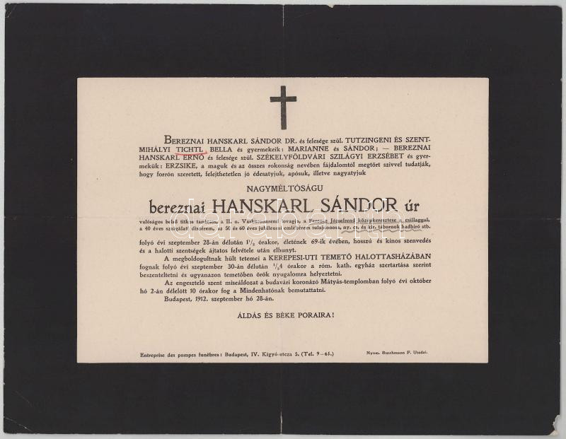 1912 Bp., bereznai Hanskarl Sándor (1843-1912) valóságos belső titkos tanácsos, cs. és kir. tábornok, hadbíró, a II. oszt. Vaskorona-rend lovagja, a Ferenc József-rend középkeresztese halotti értesítője, kisebb lapszéli sérülésekkel, 24x31 cm