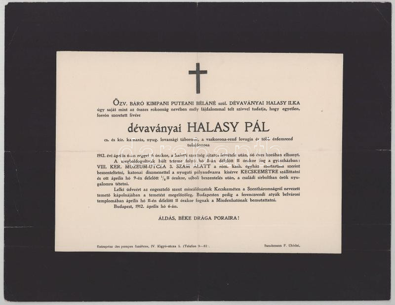 1912 Bp., dévaványai Halasy Pál (1846-1912) cs. és kir. kamarás, nyug. lovassági tábornok, a Vaskorona-rend lovagja halotti értesítője, kissé sérült, 24x31 cm