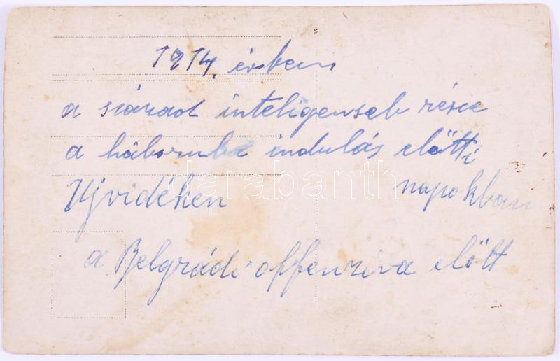 1914 Katonai csoportkép, Újvidék, a belgrádi offenzíva előtt, fotólap, hátoldalon felirattal
