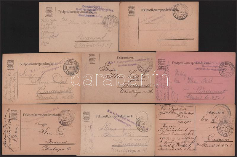 1915-1917 Halász Gyula, a pólai cs. és kir. 3. önálló vártüzér zászlóalj tiszthelyettesének 8 db tábori posta levelezőlapja, "K.u.K. MARINEFELDPOSTAMT POLA" és "K. u. k. Festungsartilleriebataillon Nr. 3. Ersatzkompagnie" bélyegzéssel
