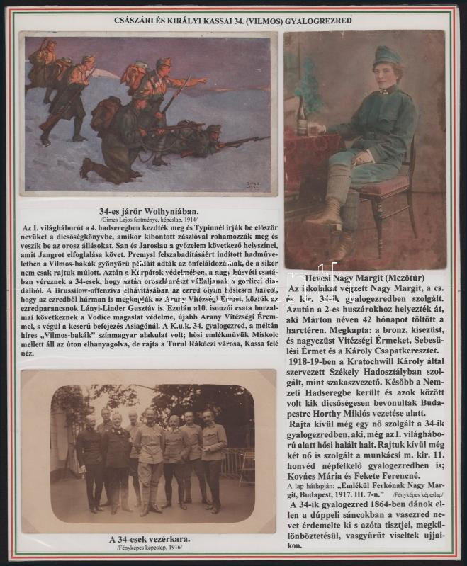 1916 A császári és királyi kassai 34. gyalogezredet bemutató gyűjtemény 5 db eredeti képeslap, fotólap kísérő szövegekkel, két nemzetiszín szegélyű tablón. (A tételek leszedhetőek)