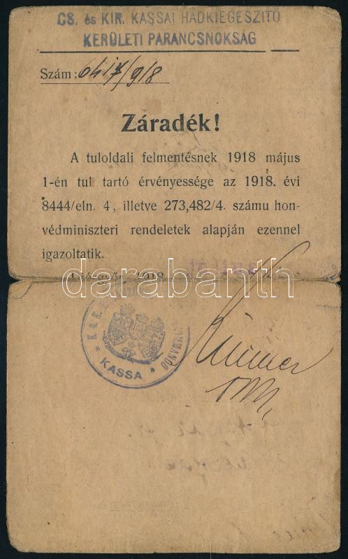 1918 Diósgyőr, cs. és kir. kassai hadkiegészítő kerületi parancsnokság által kiállított igazolvány tényleges katonai szolgálat alóli felmentésről a diósgyőri m. kir. vas- és acélgyár gépmunkása részére, kissé viseltes