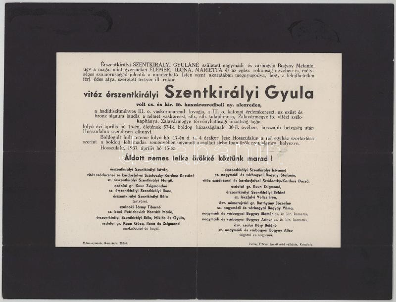 1937 Hosszúfalu, vitéz érszentkirályi Szentkirályi Gyula (1880-1937), a volt cs. és kir. 16. huszárezred alezredese, a III. oszt. Vaskorona-rend lovagja, Zala vármegye tb. vitézi székkapitánya halotti értesítője, 23x30,5 cm