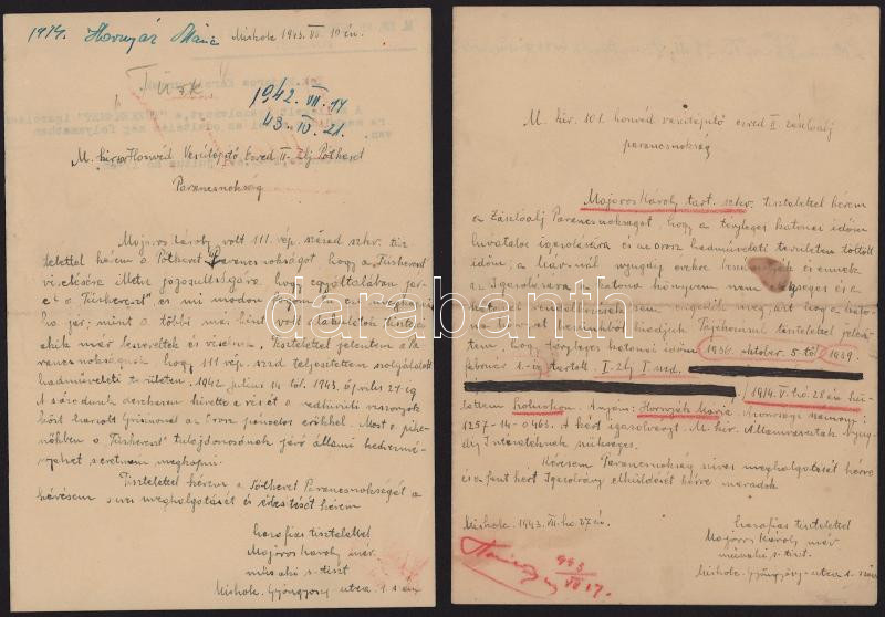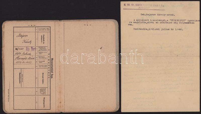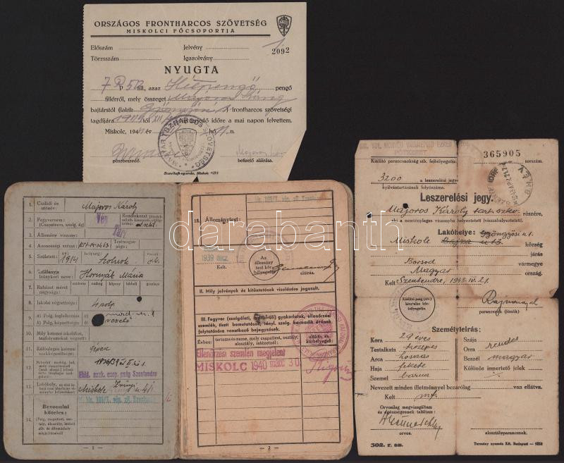 1939-1944 Majoros Károly szakaszvezető iratai, összesen 10 db: M. kir. 101. honvéd vasútépítő ezred II. zászlóalj parancsnokság által kiállított iratok, igazolvány a Tűzkereszt viselésének jogosultságáról (korabeli másolat), az Országos Frontharcos Szövetség miskolci főcsoportja által kiállított nyugta, Magyar Tűzharcos Szövetség befizetési lap, leszerelési jegy, stb.