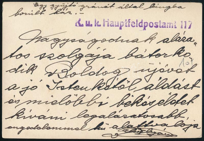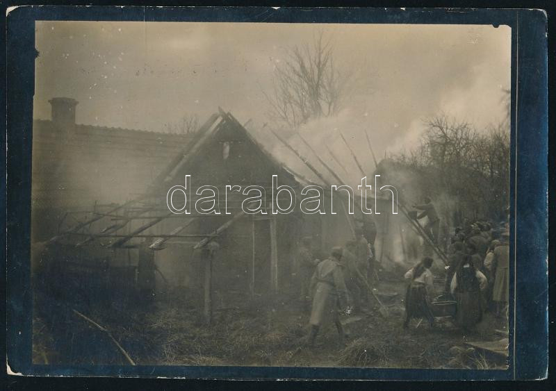 cca 1915 I. világháborús fotó, gyújtógránát által lángba borított háznál tüzet oltó katonák, a hátoldalon feliratozva, "K. u. k. Hauptfeldpostamt 117" bélyegzéssel, 9x13 cm