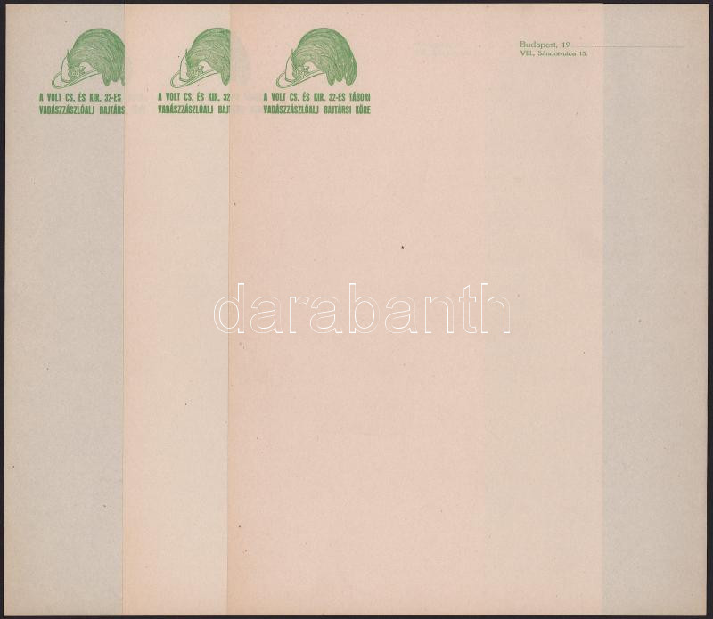 cca 1920-1940 A Volt Cs. és Kir. 32-es Tábori Vadászzászlóalj Bajtársi Körének 2 db, kitöltetlen fejléces papírja