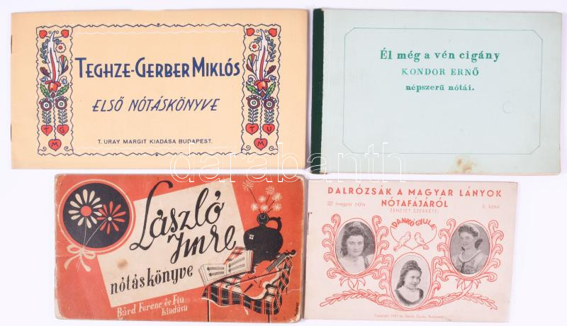 4 db nótafüzet, közte két dedikált: Teghze-Gerber Miklós első nótáskönyve. A szerző, Teghze-Gerber Miklós (1906-1969) által dedikált.; Kondor Ernő: Él még a vén cigány. - - népszerű nótái. özv. Kondor Ernőné (szül. Wald Herta Lujza Margit) által dedikált.; Dankó Gyula: Dalrózsák a magyar lányok nótafájáról.; László Imre nótáskönyve. Változó állapotban.