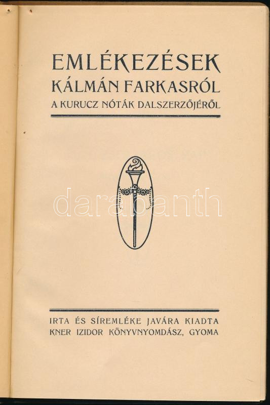 Kató József: Emlékezések Kálmán Farkasról a kuruc nóták dalszerzőjéről. Gyoma, Kner Izidor. Kiadói egészvászon kötés, kissé kopottas állapotban.
