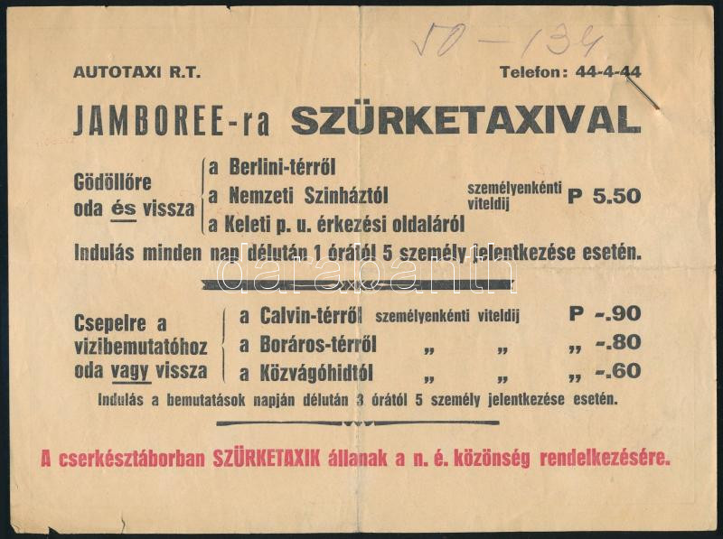 1933 IV. Cserkész Világjamboree Gödöllő, utazási kedvezményre jogosító kitűző a 6. napra, Szürke Taxi jamboree reklám térképpel /
