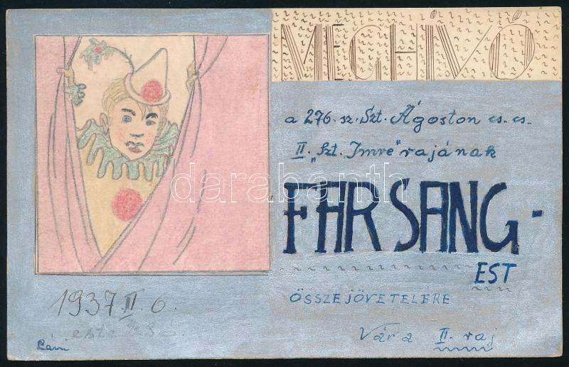 1937 A 276. Szt. Ágoston cserkészcsapat farsangi estjére szóló kézzel rajzolt meghívó, jó állapotban