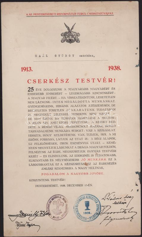 1938 Pesterzsébet Turul cserkészcsapat oklevél 20x35 cm