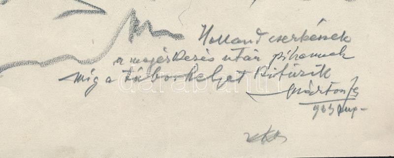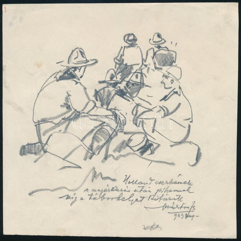 Márton Ferenc (1884-1940): 1933 Gödöllői Jamboree - Holland cserkészek a megérkezés után. Ceruza, papír, jelzett, / Scout Jamboree 1933. Gödöllő, Dutch scouts after arriwal. Pencil drawing 20x18 cm