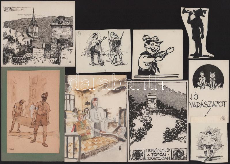 ca 1930-1940 10db cserkész grafika, egyedi rajz, több hátulján nyomda jelekkel, ami azt jelzi, hogy megjelent grafikák, több alkotótól. 10x16 cm-ig.