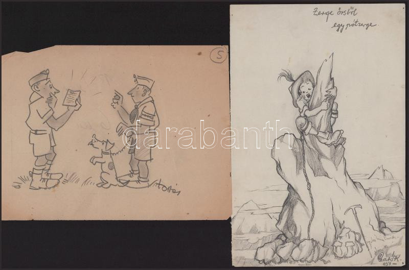 ca 1930-1940 4 db cserkész grafika, egyedi rajz, több hátulján nyomda jelekkel, ami azt jelzi, hogy megjelent grafikák, több alkotótól. 25x14 cm-ig.