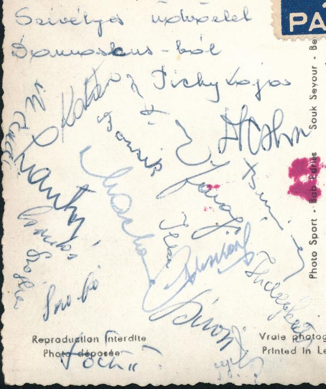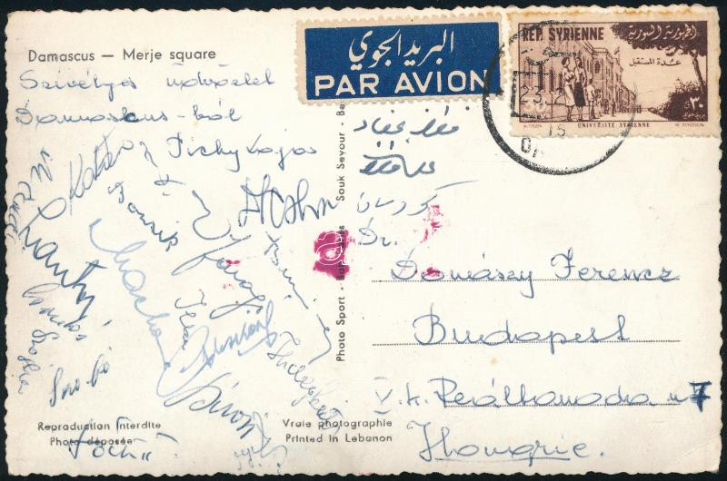 1956. február 25-26-én Damaszkuszban Magyarország (Budapest válogatott néven) ? Szíriai Hadsereg Válogatott 4:0, 6:0 mérkőzésekről hazaküldött képeslap a magyar labdarúgó csapat tagjai által aláírva, hazaküldve, az Aranycsapat tagjai által is. Bozsik, Hidegkúti, Tóth II. Lantos, Tichy, Szojka, Buzánszky Postcard sent home from the matches Hungary (under the name Budapest National Team) ? Syrian Army National Team 4:0, 6:0 in Damascus on February 25-26, 1956, signed by the members of the Hungarian football team, sent home, and also by the members of the Golden Team. Bozsik, Hidegkúti, Tóth II. Lantos, Tichy, Szojka, Buzánszky