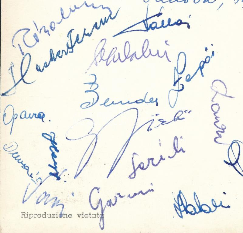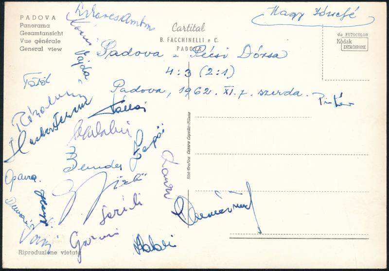 A Pécsi Dózsa SC Calcio Padova elleni mérkőzése után ( 4 : 3) amagyar labdarúgók által aláírt képeslap. Zengői István, Bendes Tibor, Hegyi Sándor, Vajda Lajos, Kocsis Ernő, Halasi Tibor, Györkő Antal, Garami József, Vári György, Dunai János, Török Bálint