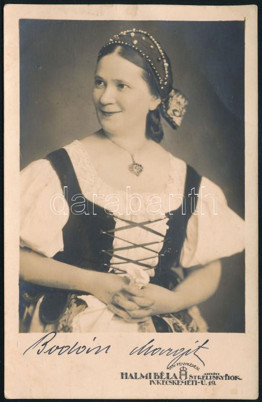 Bodán Margit (1893-?): színésznő, dalénekesnő autográf aláírása őt ábrázoló fotólapon, 13,5x8,5 cm