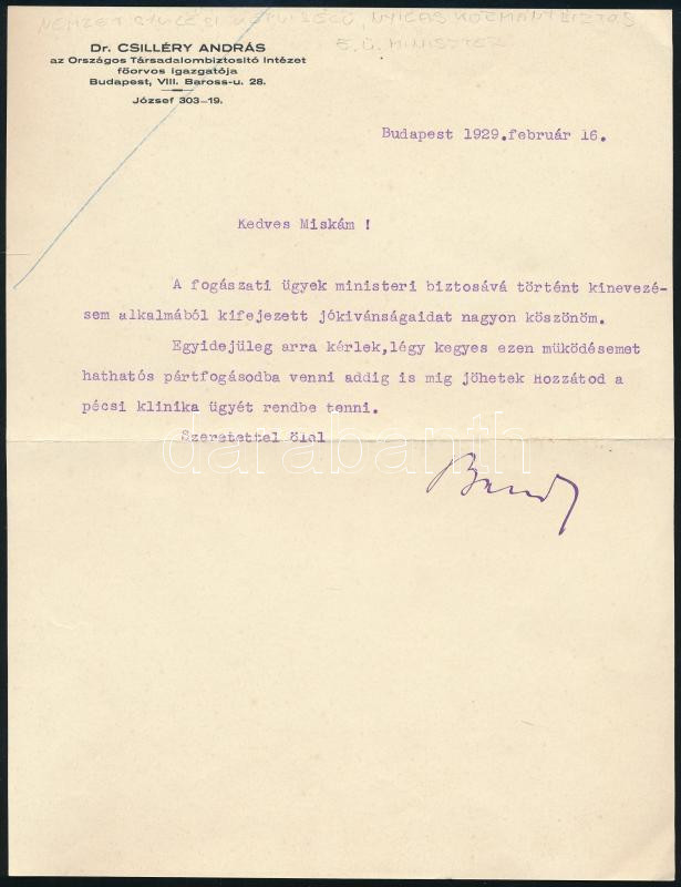 Csilléry András (1883-1964) népegészségügyi (népjóléti) miniszter aláírása
