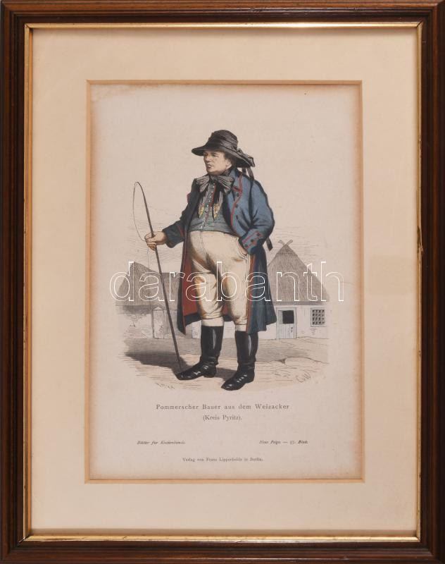 "Pommerscher Bauer aus dem Weizacker (Kreis Pyritz)" Blätter für Kostümkunde Neue Folge 57. Blatt, Berlin, Franz Lipperheide-ny., papír, színezett fametszet, paszpartuban, üvegezett fakeretben, 26x17 cm, keret: 38x28 cm