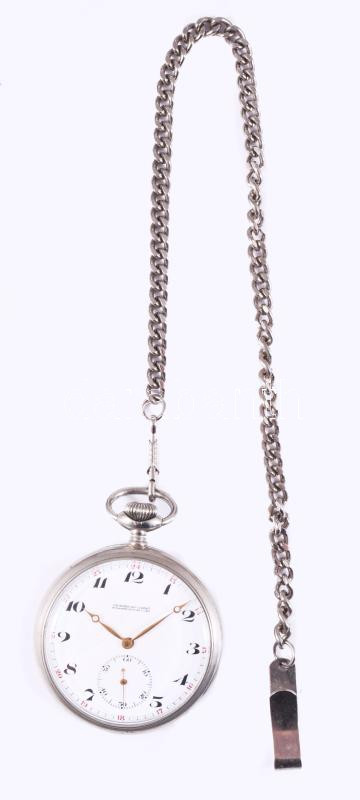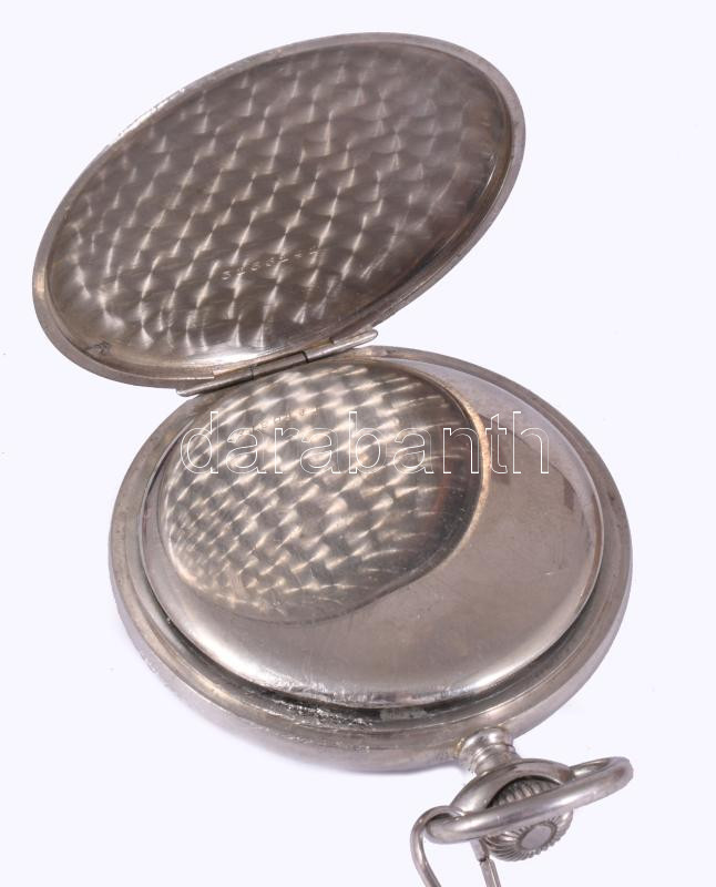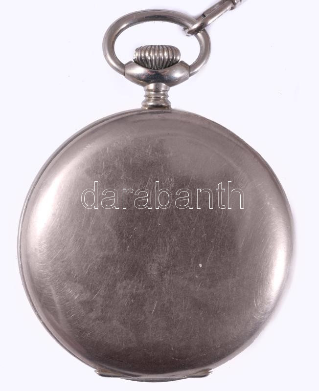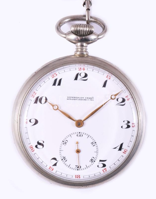 Weinberger Dezső órásmester jelzett számlapos zsebóra, fém tokkal, fém lánccal, működő, jó állapotban d: 54 mm