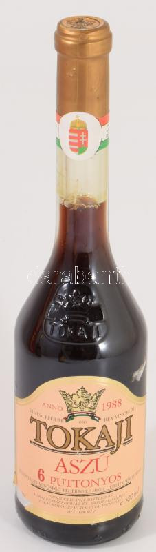 1988 Tokaji 6 puttonyos tokaji aszú, bontatlan palack, édes fehér desszertbor, kissé sérült címkével, 12%, 0,5l