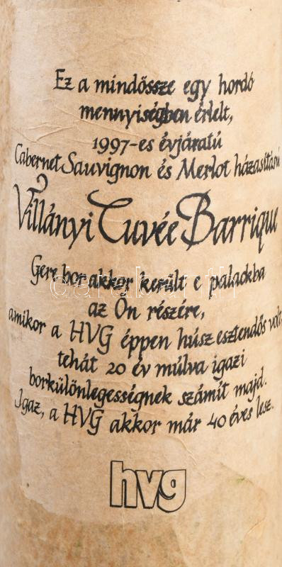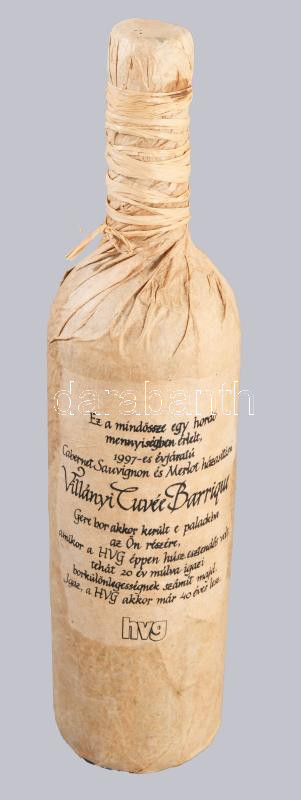1997 Gere villányi cuvée, házasÃtás Cabernet Sauvignon és Merlot fajtákból, Gere Attila pincészet ikonikus csúcsborának méltó párja. A felirat szerint csak egy hordó készült belÅ‘le és a HVG 20. születésnapjára palackozták bontatlan palack száraz vörösbor, 13%, 0,75 l.