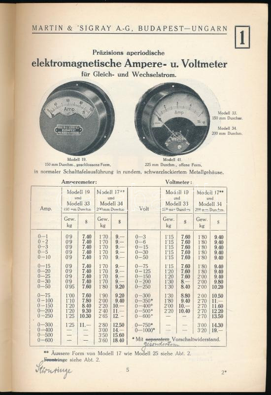 1924 Elektrische Messinstrumente, Martin & 'Sigray A. G. Fabrik für elektrische Messinstrumente. (Bp., IV., Váci u. 58.) Elektromos mérÅ‘műszerek katalógusa/árjegyzéke, fekete-fehér képekkel, német nyelven. Bp., Hornyánszky-ny., 34+[2] p. Kiadói tűzött papÃrkötés.