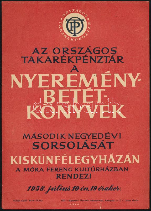 1958 Fery Antal (1908-1994): "Az Országos Takarékpénztár a nyereménybetétkönyvek második negyedévi sorsolását Kiskunfélegyházán a Móra Ferenc kultúrházban rendezei, 1958, július 10. 19 órakor", OTP reklám villamosplakát, Bp., Egytemi-ny., kis szakadással, 24x17 cm