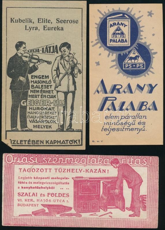 3 db iparcikk számolócédula (Arany Palaba, Geiger-féle húrok, Szalai és Földes kazán)