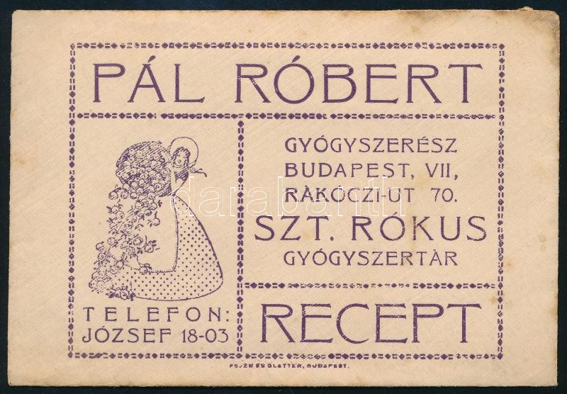 Pál Róbert Gyógyszerész Szent Rókus Gyógyszertárának receptborítékja, benne recepttel