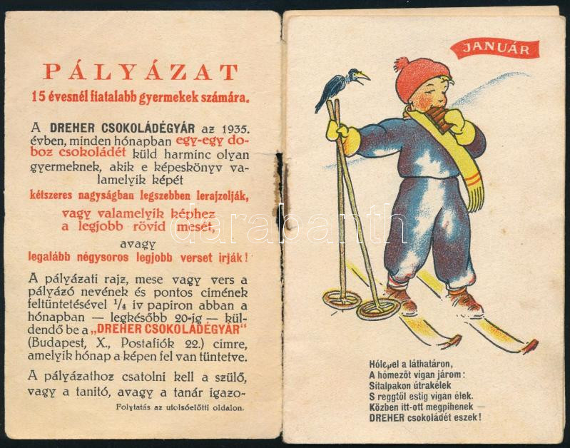 cca 1939 Dreher édesség és csokoládé reklám: képeskönyv, hónapokra szóló színes illusztrációkkal, versikékkel, 14 p. 12 cm