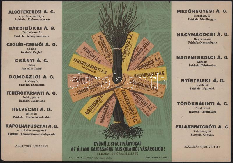 cca 1960-1970 "Gyümölcsoltványokat az állami gazdaságok faiskoláiból vásároljon! Lerakatok országszerte", reklám plakát, Állami Gazdaságok Kereskedelmi Irodája, Terv-ny., szakadással, hajtásnyommal, gyűrődéssel, 23x32 cm