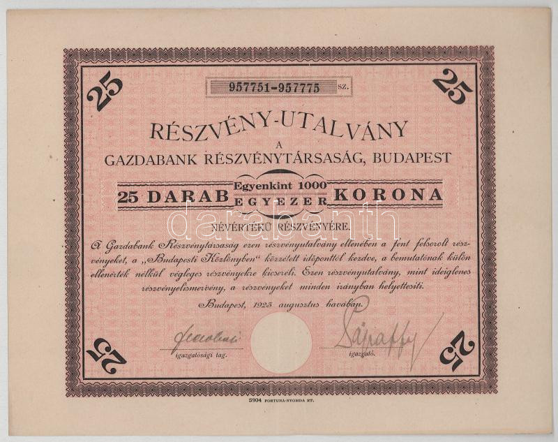 1923. Budapest "Gazdabank Részvénytársaság" részvényutalványa huszonöt darab részvényről, összesen 25.000K értékben T:F szép papír
