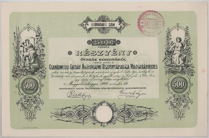 1924. Magyarbánhegyes "A Csanádvármegyei Szövetkezeti Áruforgalmi Részvénytársaság" névre szóló részvénye 500K-ról, felülbélyegzéssel T:AU
