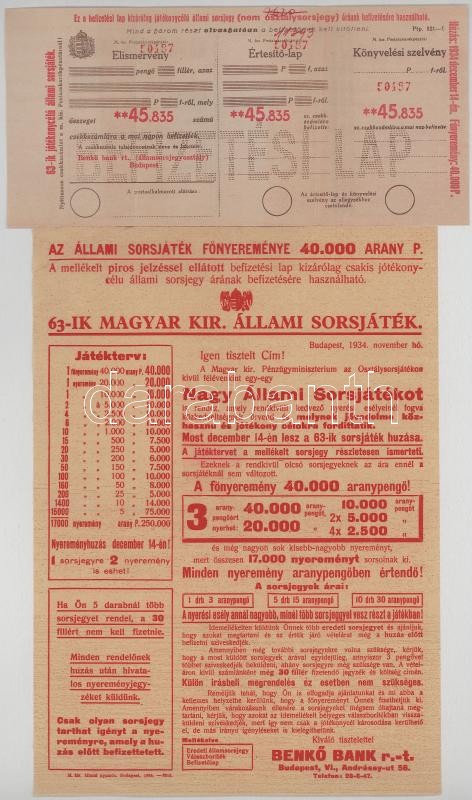 1935. "33. Magyar Királyi Osztálysorsjáték" 3. osztály egynyolcad sorsjegye "H", vízjeles papíron, a "Benkő Bank Rt." bélyegzőjével, felbélyegzett borítékkal, a cég levelével, nyereményjegyzékével és tájékoztatójával, valamint a befizetésről szóló elismervénnyel T:AU