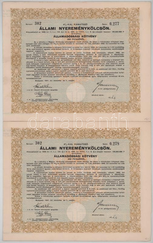 1941. Budapest "4%-kal kamatozó Állami Nyereménykölcsön - Államadóssági kötvény" 200P-ről szárazpecséttel, szelvényekkel (2x) sorszámkövetők "302 0.277 - 302 0.278" T:AU
