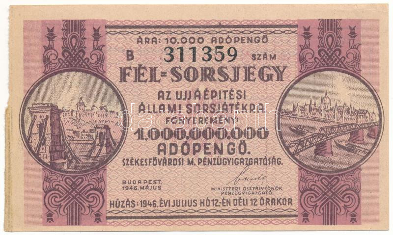 1946. "Újjáépítési Állami Sorsjáték" 1.000.000.000AP értékű fél-sorsjegye vízjeles papíron T:AU