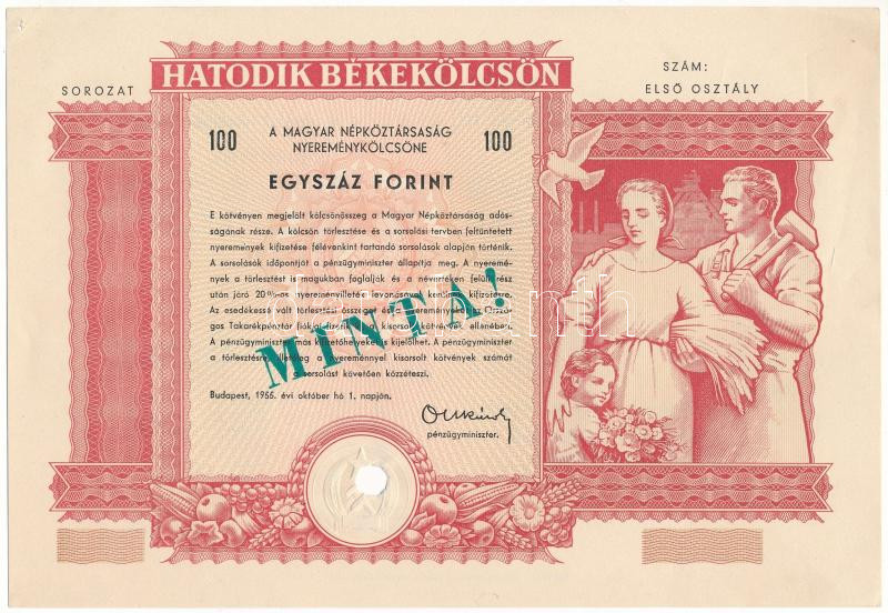 1955. "Hatodik Békekölcsön" nyereménykölcsön 100Ft-ról "MINTA!" felülbélyegzéssel, sorszám nélkül, szárazpecséttel lyukasztással érvénytelenítve T:AU,XF hajtatlan, de több tűnyom