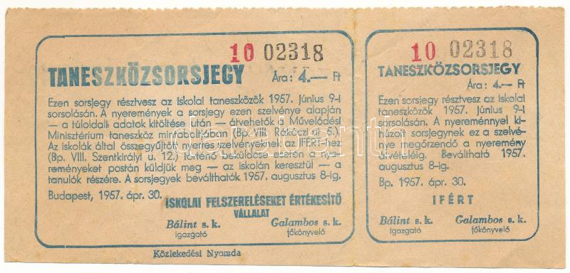 1957. "Iskolai Felszereléseket Értékesítő Vállalat - Taneszközsorsjegy" sorsjegye 4Ft-ról T:F