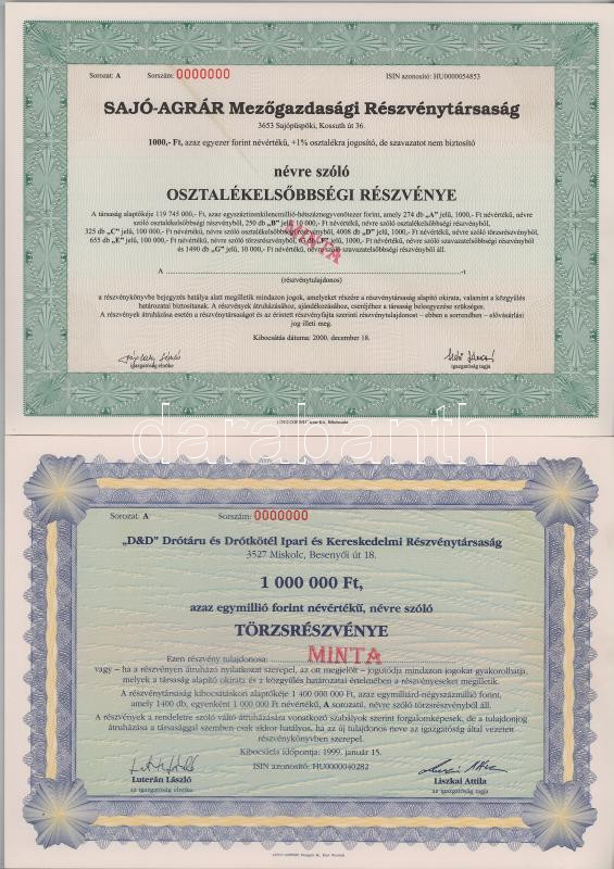 1999. "D&D Drótáru és Drótkötél Ipari és Kereskedelmi Részvénytársaság" törzsrészvénye 1.000.000Ft-ról, "MINTA" bélyegzéssel és "000"-ás sorszámmal + 2000. "Sajó-Agrár Mezőgazdasági Részvénytársaság" osztalékelsőbbségi részvénye 1000Ft-ról, "MINTA" bélyegzéssel és "000"-ás sorszámmal T:AU