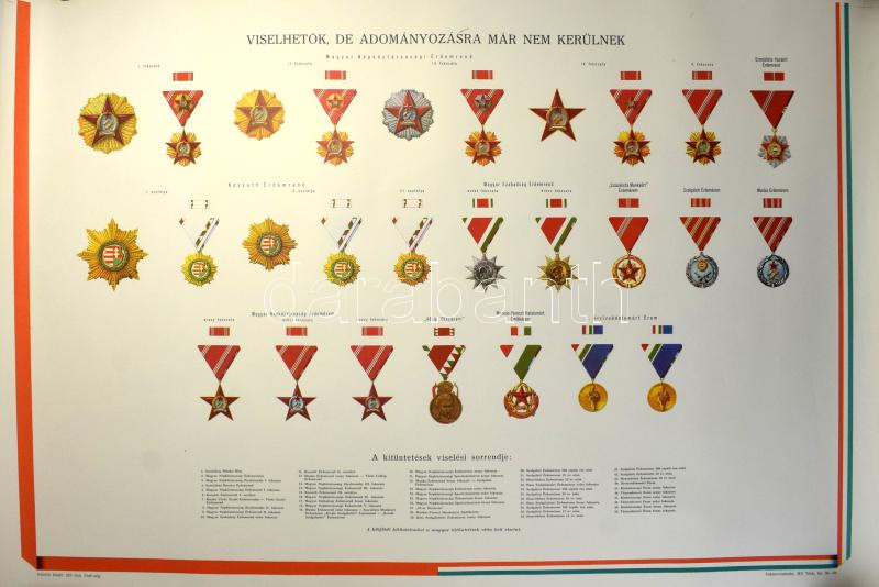 1970-1980. "Viselhető, de már nem adományozható kitüntetések listája" nagyméretű plakáton, képekkel a kitüntetésekről. Sokszorosította a Magyar Néphadsereg Térképészeti Intézete. Használt, de jó állapotban