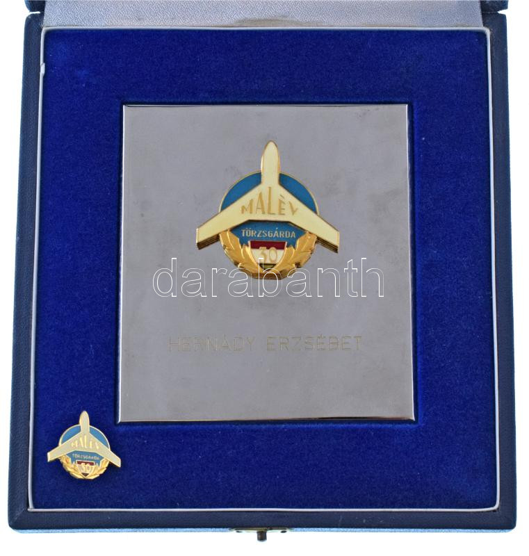 1980 k. "MALÉV Törzsgárda - 30 év után" aranyozott, műgyantás törzsgárda jelvény névre szóló fém plaketten, miniatűrrel, eredeti dísztokban (43x42mm, 89x101mm) T:AU