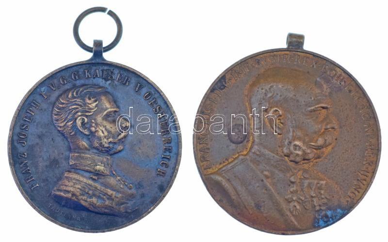 1898. "Jubileumi Emlékérem Fegyveres Erő Számára / Signum memoriae (AVSTR)" bronz kitüntetés mellszalag nélkül + 1914. "Ferenc József Bronz Vitézségi Érem" bronz kitüntetés mellszalag nélkül. Szign.: Tautenhayn T:XF patina