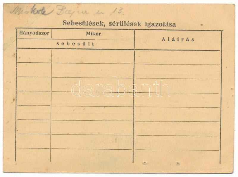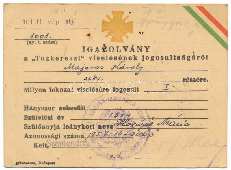 1943. Névre szóló, kitöltött viselői igazolvány a Tűzkereszt I. fokozatához, részben kiolvasható "M. Kir. 101. honvéd vasut ezred pótkeret" pecséttel T:VF