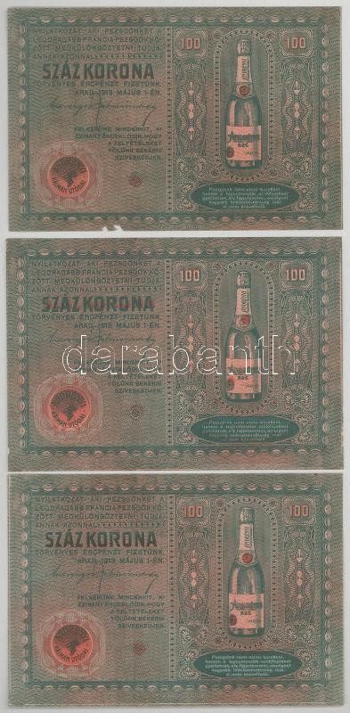 1913. május 1. Arad "Andrényi Kálmán Utódai" pezsgőreklám nyereményjáték felhívással 100K-ról (3x) T:AU,XF hajtatlanok, de sarokhajlás, anyaghiány, folt