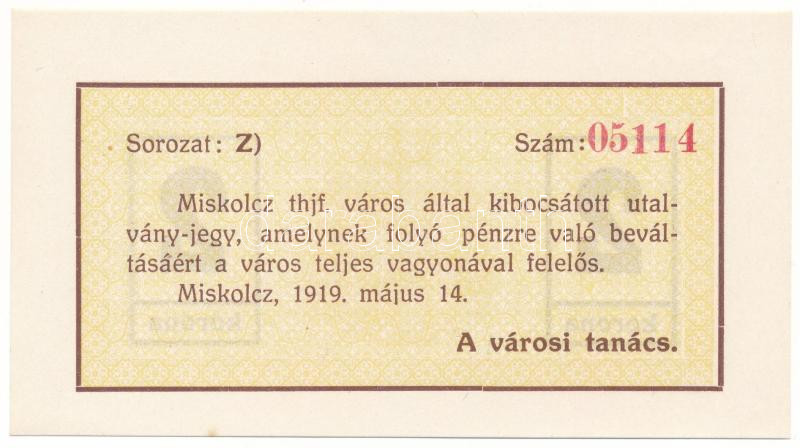 1919. Miskolc 05.14. 2K "Miskolcz város" utalvány-jegye "Z 05114" sorszámmal T:AU