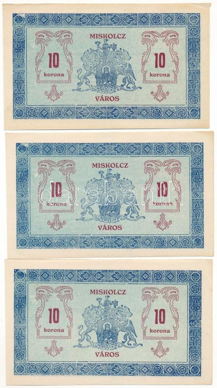 Hungary / Miskolc 14.05.1919. 10 Korona "Miskolcz város" (3x) consecutive serials "B) 187 20 - B) 187 22" C:AU-XF