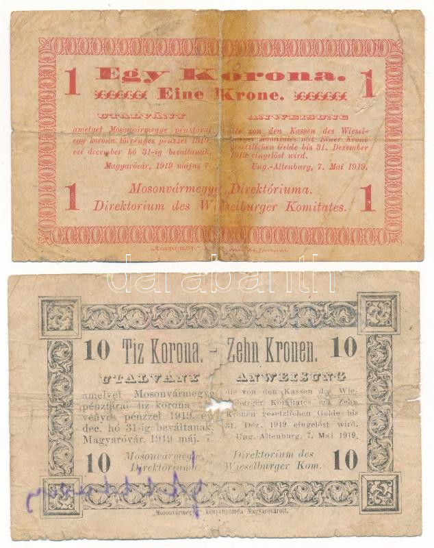 1919. május 7. Magyaróvár / Mosonvármegye Direktóriuma 1K + 10K, mindkettő hátoldalán bélyegzés, aláírások és sorszám T:G